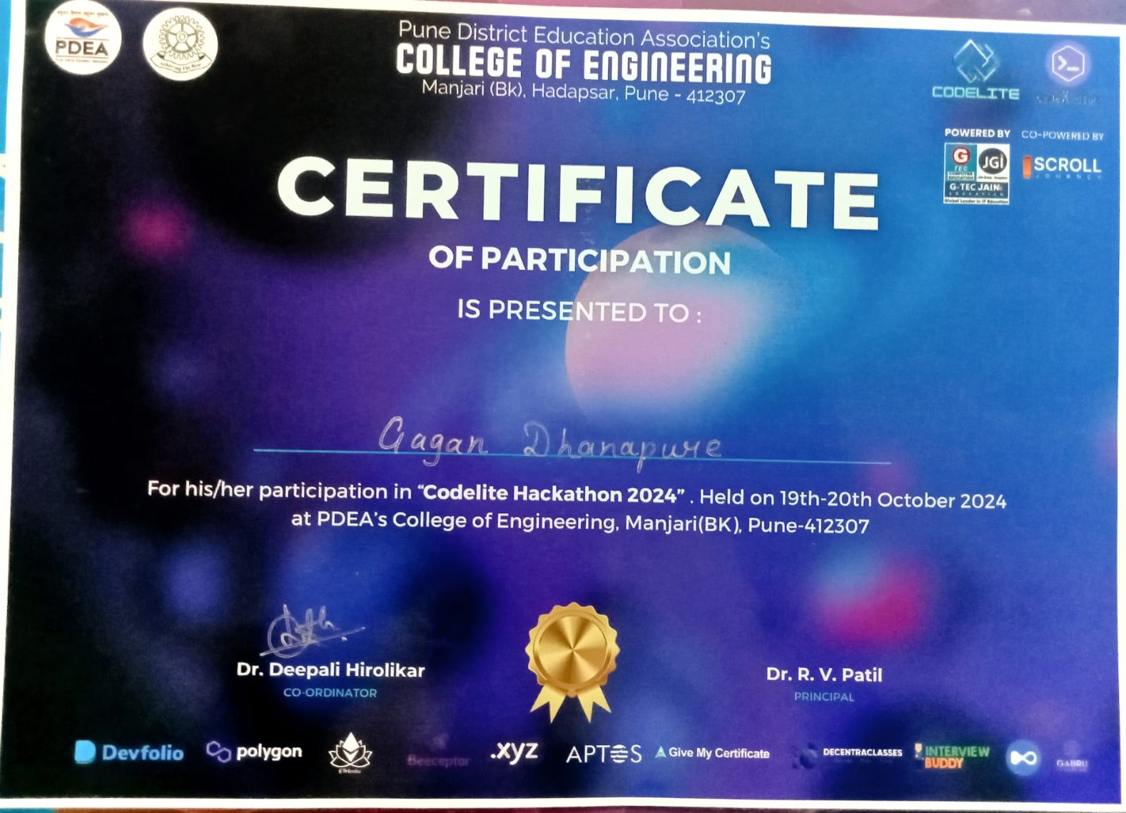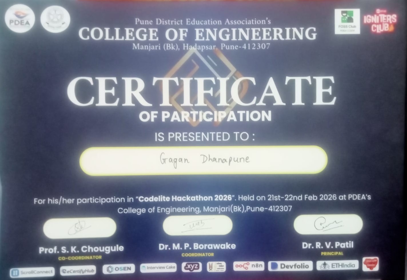 Ranked in the Top 10 at the Codelite Pan-India Hackathon, competing against participants nationwide. Demonstrated problem-solving and technical execution under pressure.