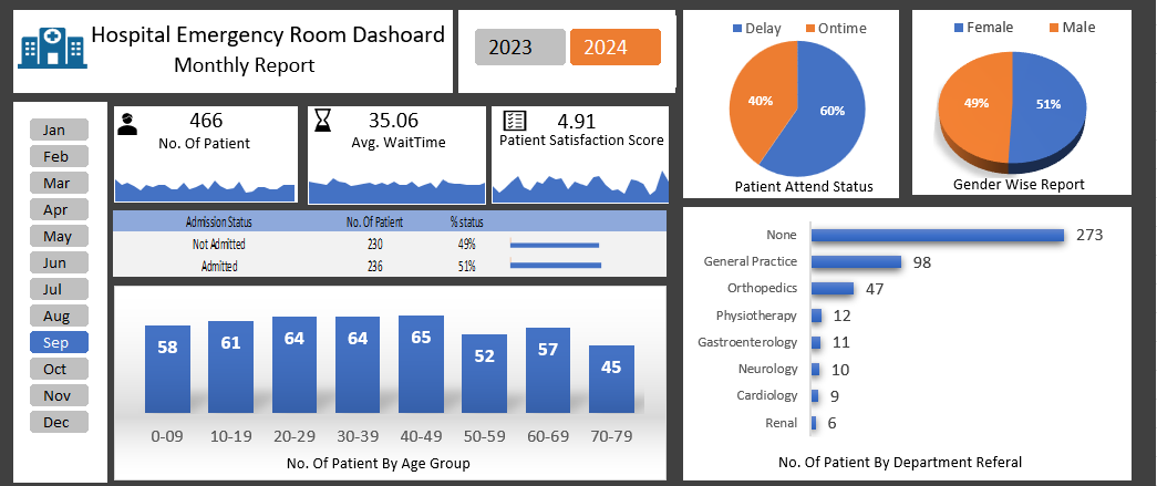 Interactive Excel dashboard for hospital ER analytics. Power Query for data transformation, DAX for patient categorization, wait time analysis, and performance tracking KPIs.